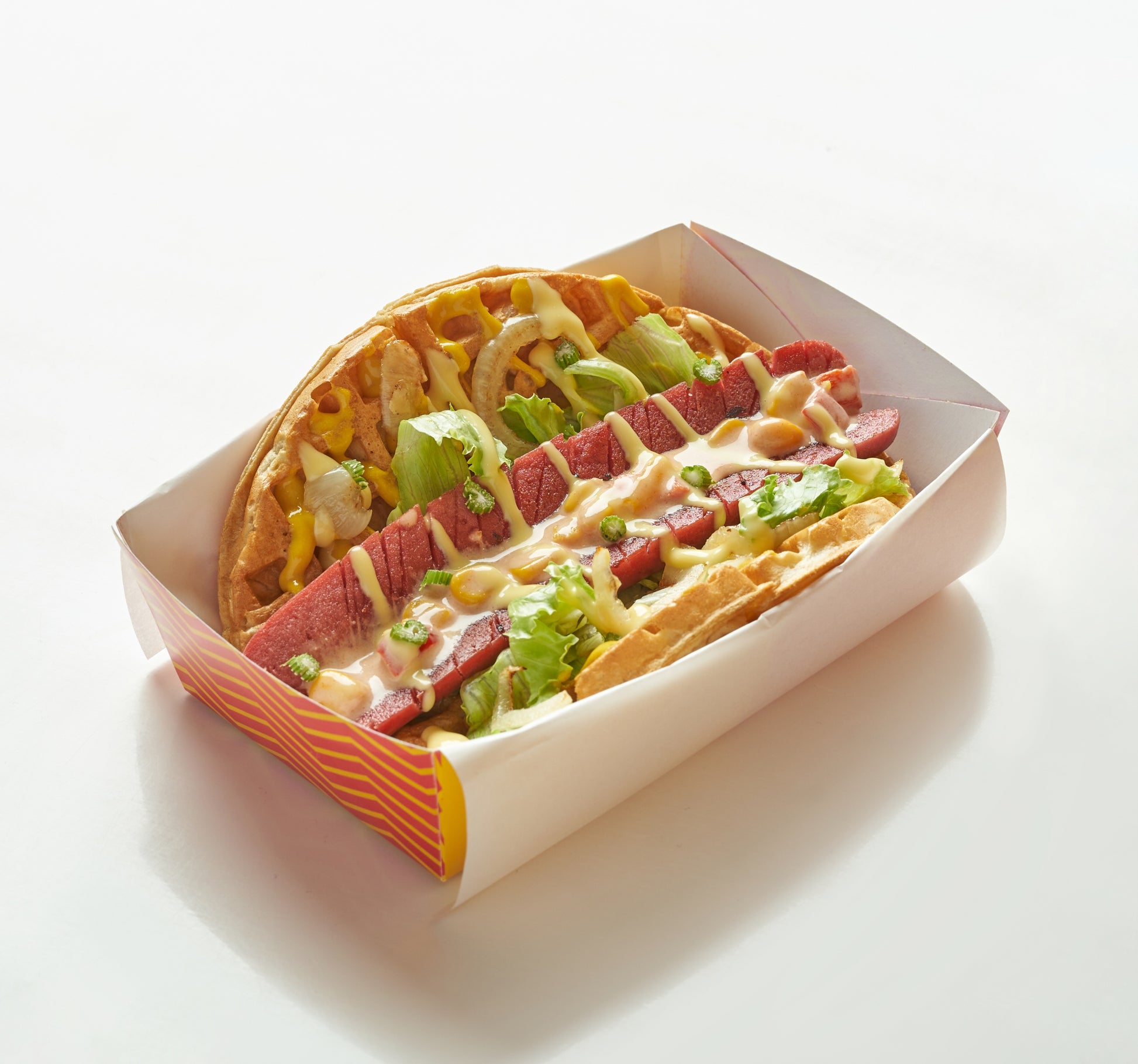 Hotdog wirh lettuce , onion , santafi sauce , cheese sauce in waffle